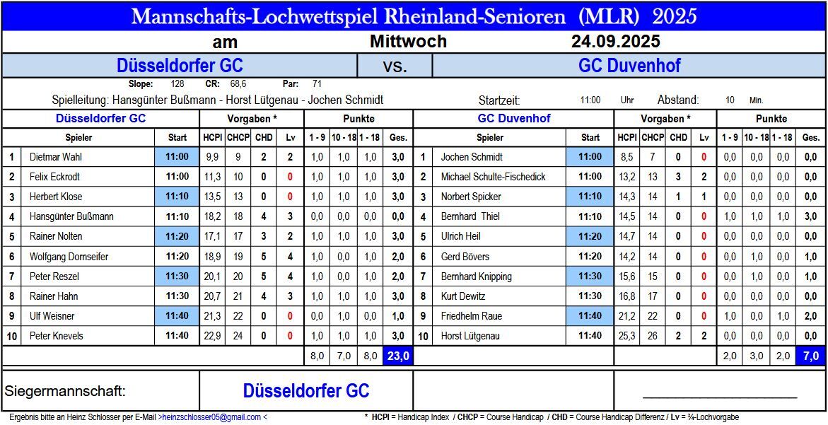 Am 24.09.2025 wurde auf unserer Anlage das Endspiel der "Mannschafts-Lochwettspiel Serie Rheinland-Senioren", zwischen dem Golfclub Duvenhof und dem DGC ausgetragen.